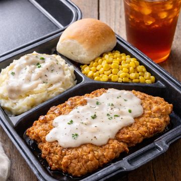 Chicken Fried Steak, Mashed potatoes, Corn, Bread, & Drink