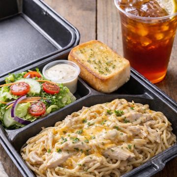 Chicken Spaghetti, Salad, Salad Dressing, Bread, and Drink