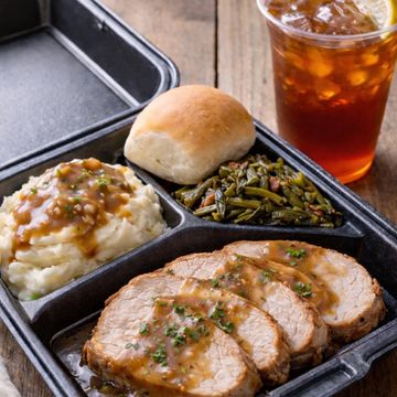 Pork Roast, Mashed Potatoes, Green Beans, Bread, and Drink