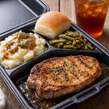Pork Chop, Mashed potatoes, Green Beans, Bread, & Drink